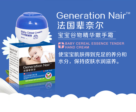 “Generation Nair法國輩奈爾”是公司傾力打造研發的核心品牌,秉承“取自然之初,育生命之初”的品牌核心理念,積極打造一個更安全,更放心的嬰童護理品牌。我們堅持運用先進的生物科技提煉天然谷物精華來生產“Generation Nair 法國輩奈爾”系列嬰童護理產品,并對生產工藝和產品質量嚴格把關,為寶寶的成長我們竭盡全力。